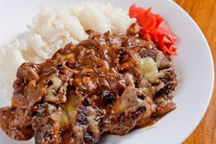 ジューシーなハンバーグをデミソースで煮込んでチーズをトッピング。